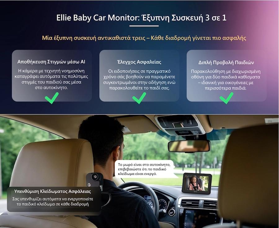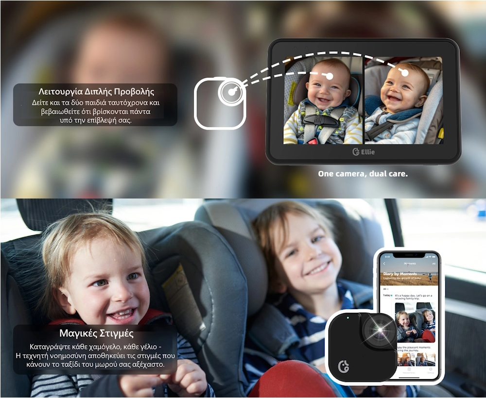 Με μοντέρνο σχεδιασμό, έξυπνα χαρακτηριστικά και υψηλή ποιότητα υλικών, η Ellie Baby Car Monitor είναι η κάμερα παρακολούθησης μωρού αυτοκινήτου που εμπιστεύονται χιλιάδες γονείς παγκοσμίως. Εξασφαλίζει γαλήνη και ασφάλεια στις μετακινήσεις, είτε πρόκειται για την καθημερινή διαδρομή στο σχολείο είτε για ταξίδι.