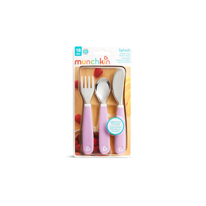 Τα μωβ βρεφικά μαχαιροπίρουνα Munchkin Splash διαθέτουν εργονομικές λαβές με ειδική αντιολισθητική επιφάνεια, που επιτρέπουν στο παιδί να τα κρατά με άνεση και σταθερότητα. Ο σχεδιασμός τους ενισχύει τη σωστή στάση των δαχτύλων και διευκολύνει τη μετάβαση από τη φάση του φαγητού με τα χέρια στη χρήση μαχαιροπίρουνων. Είναι στρογγυλεμένα στις άκρες για απόλυτη ασφάλεια και ιδανικά για την εκπαίδευση στις πρώτες δεξιότητες λεπτής κινητικότητας.