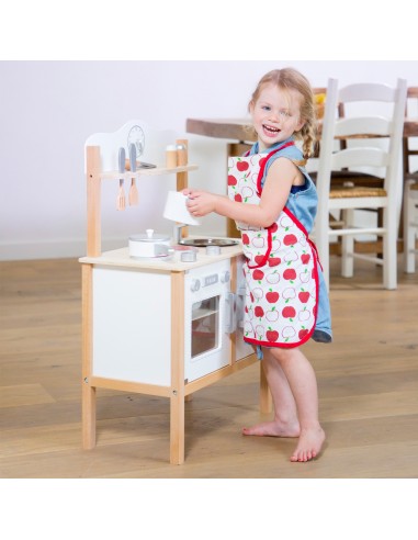 Η κουζίνα διαθέτει εστία με δύο μάτια, φούρνο με διάφανη πόρτα, αφαιρούμενο νεροχύτη, ράφια αποθήκευσης και ρολόι με κινητούς δείκτες. Περιλαμβάνει επίσης κατσαρόλα με καπάκι, τηγάνι, τρία μαγειρικά σκεύη, αλάτι και πιπέρι — ό,τι χρειάζεται ένας μικρός σεφ για να ετοιμάσει το “τέλειο γεύμα”!