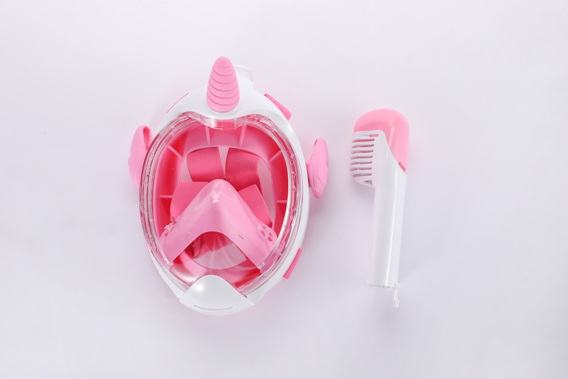 Παιδική μάσκα θαλάσσης μονόκερος σε ροζ απόχρωση, από τον κατασκευαστή Thenice, σχεδιασμένη για άνετη και ευχάριστη γνωριμία των παιδιών με το snorkeling στην επιφάνεια. Η full-face φιλοσοφία προσφέρει μια πιο φυσική εμπειρία: το παιδί μπορεί να αναπνέει ήρεμα με το πρόσωπο στο νερό, χωρίς να ασχολείται με ξεχωριστό αναπνευστήρα στο στόμα. Ο σχεδιασμός «μονόκερος» σε ροζ χρώμα κάνει το προϊόν άμεσα αγαπητό, ενθαρρύνοντας τα παιδιά να τη φορούν σωστά και να απολαμβάνουν το παιχνίδι τους στη θάλασσα ή στην πισίνα. Η μάσκα είναι κατασκευασμένη από υποαλλεργική σιλικόνη τροφίμων και πλαστικό.