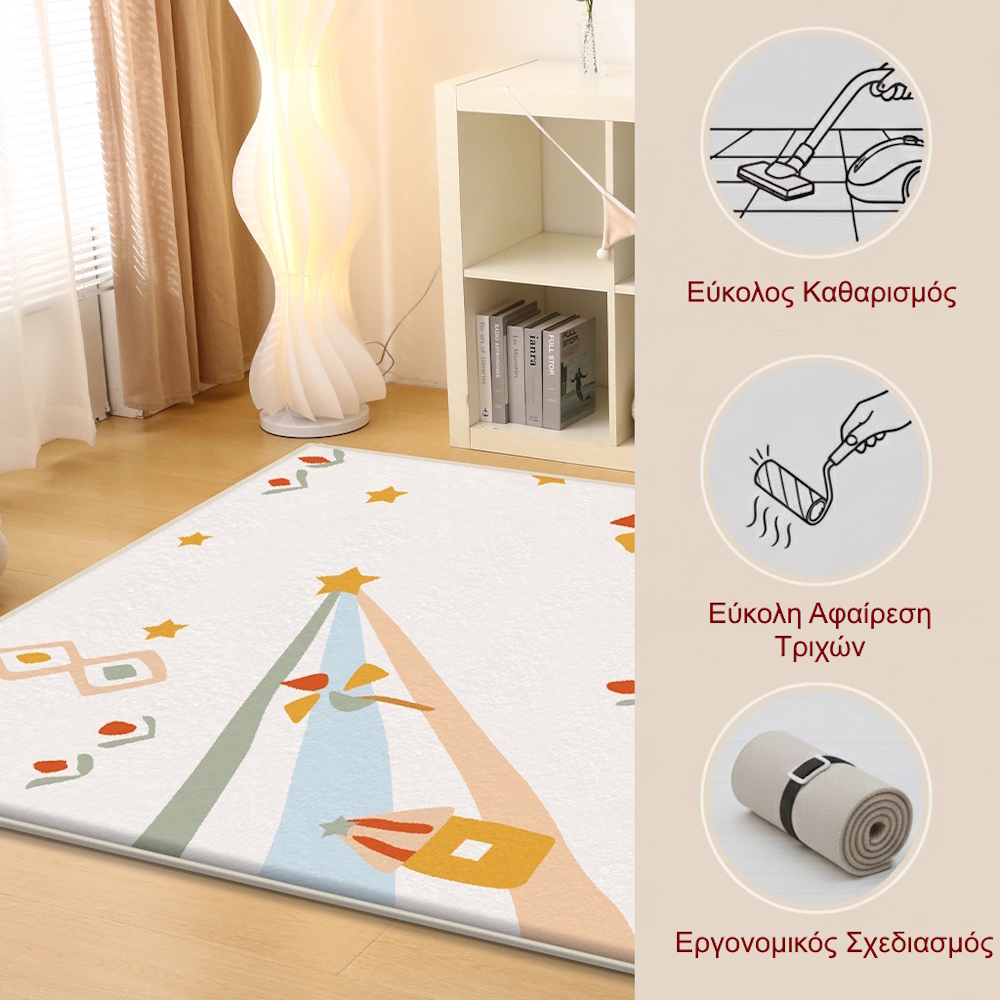 Το σχέδιο “Little Star Circus” ξεχωρίζει για τη minimal και παιχνιδιάρικη αισθητική του. Απαλές αποχρώσεις του λευκού, του μπεζ, του παστέλ πράσινου, του απαλού μπλε και των θερμών γήινων τόνων δημιουργούν ένα ουδέτερο αποτέλεσμα που ταιριάζει εύκολα τόσο σε παιδικό δωμάτιο όσο και σε καθιστικό. Τα μοτίβα με αστέρια, γεωμετρικά σχήματα και παιχνιδιάρικες λεπτομέρειες ενισχύουν τη φαντασία του παιδιού χωρίς να κουράζουν οπτικά τον χώρο.