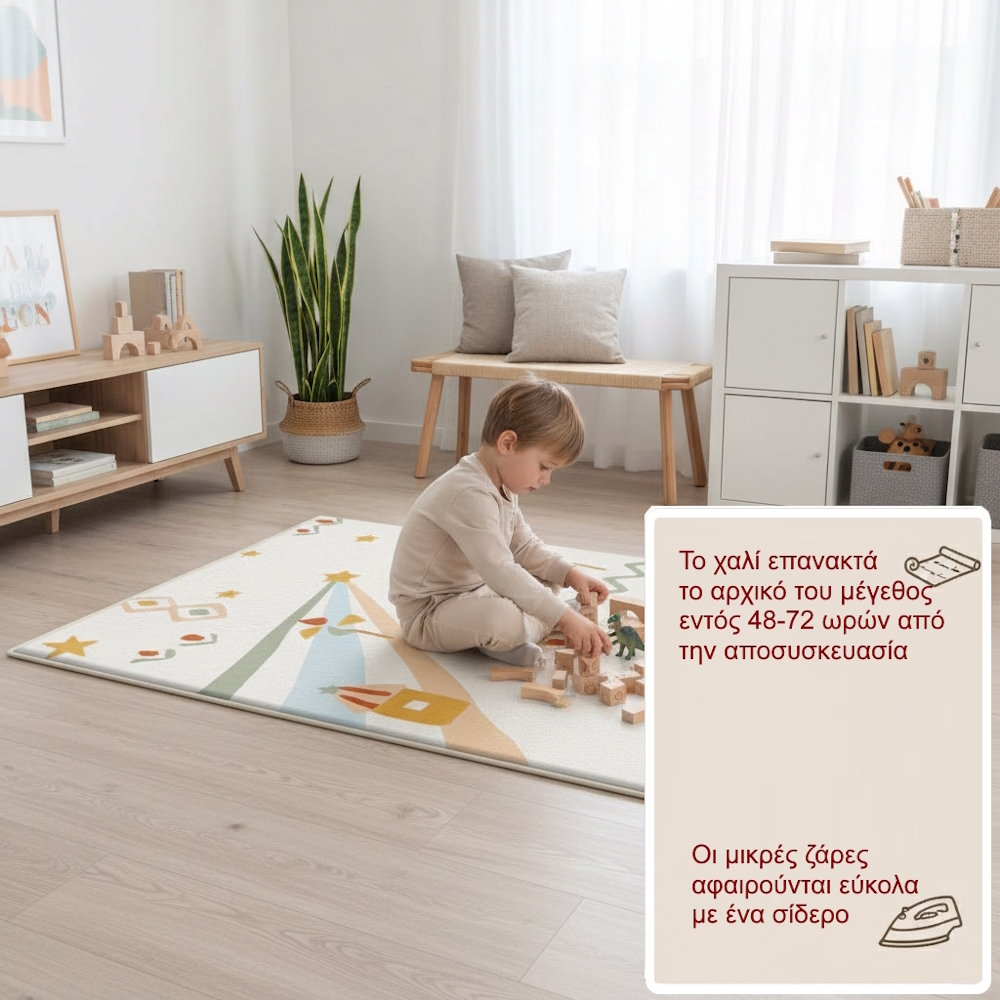 Μετά την αποσυσκευασία, το χαλάκι επανέρχεται στο αρχικό του μέγεθος και σχήμα εντός 48–72 ωρών. Τυχόν μικρές ζάρες που μπορεί να εμφανιστούν από τη συσκευασία αφαιρούνται εύκολα με ελαφρύ σιδέρωμα, σύμφωνα με τις οδηγίες χρήσης.