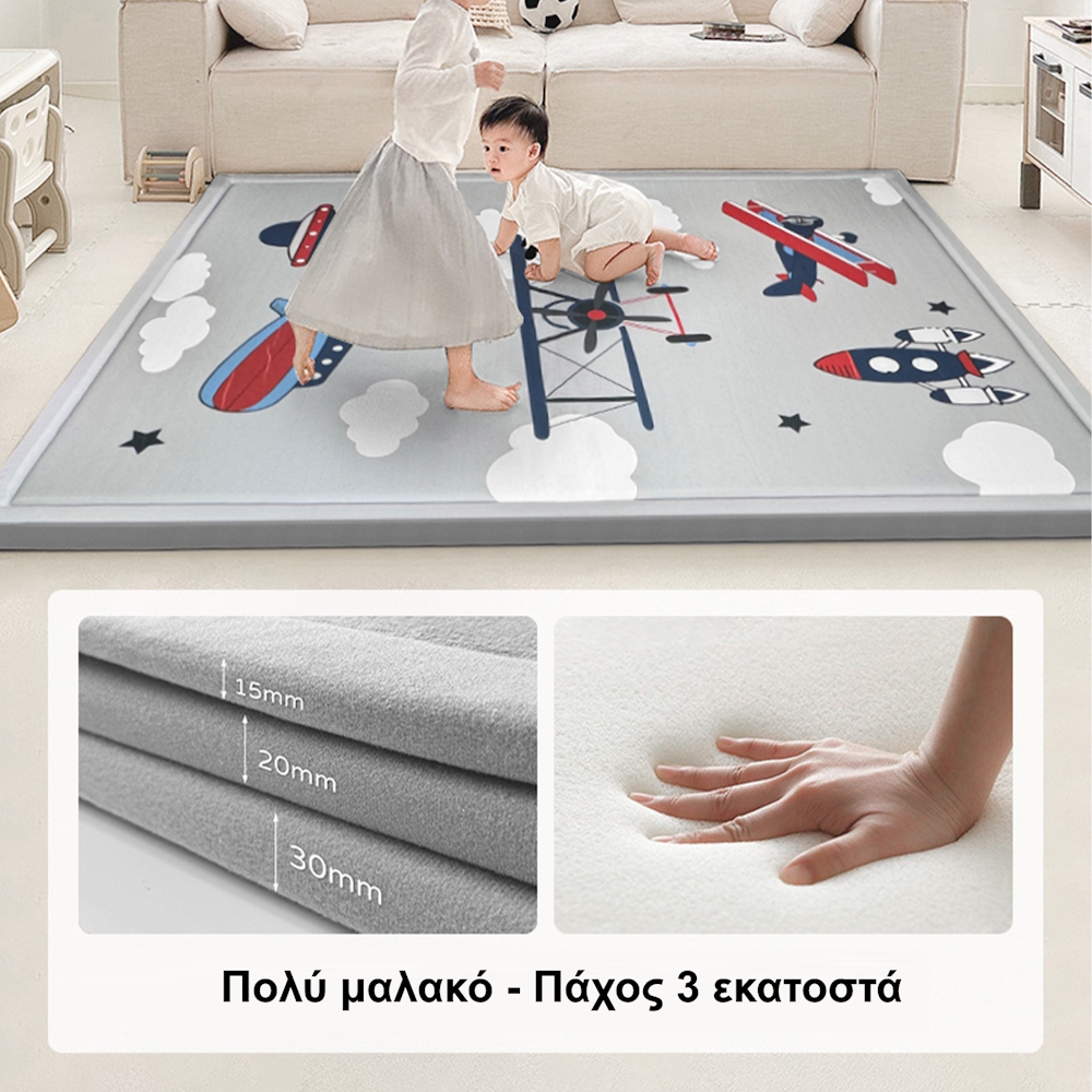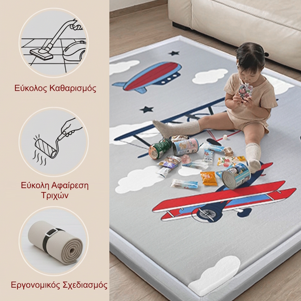 Το Παιδικό χαλί δραστηριοτήτων Giggles & Co. “Cloud Pilots” είναι σχεδιασμένο για να προσφέρει στα παιδιά έναν ασφαλή, άνετο και δημιουργικό χώρο παιχνιδιού, από τις πρώτες κιόλας ημέρες της ζωής τους. Με διαστάσεις 200 × 150 εκ. και αυξημένο πάχος 3 εκατοστών, δημιουργεί μια προστατευμένη επιφάνεια που μετατρέπει το πάτωμα σε έναν φιλόξενο χώρο για μπουσούλημα, παιχνίδι, χαλάρωση και εξερεύνηση.