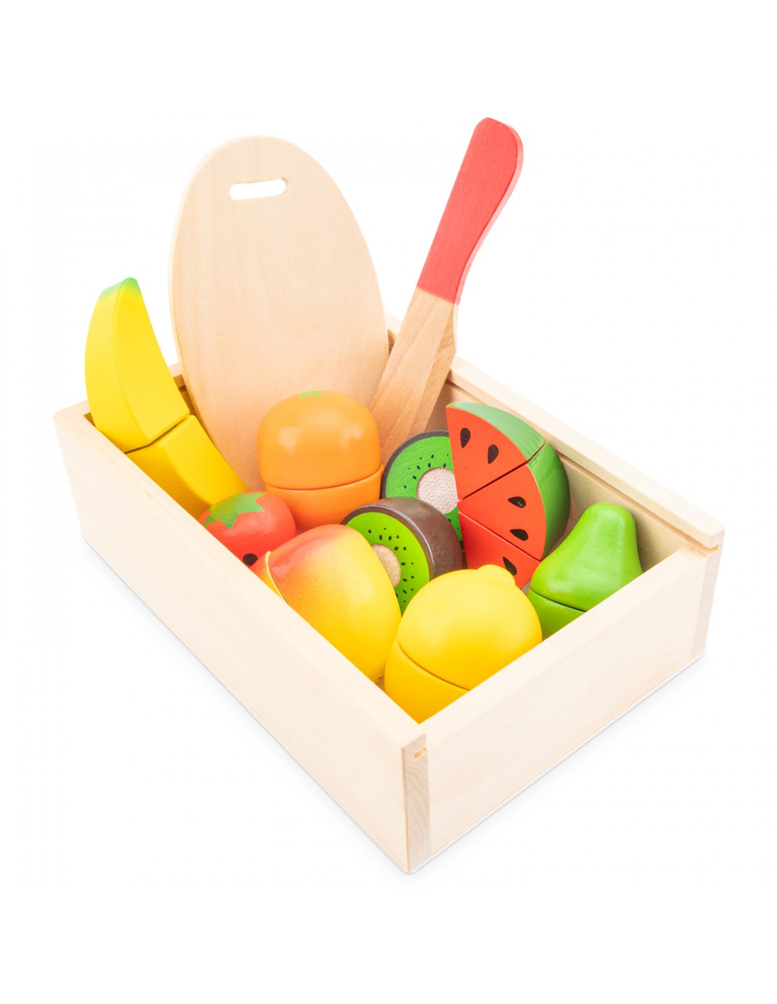 Το σετ περιλαμβάνει ξύλο κοπής, οκτώ φρούτα (όπως μήλο, μπανάνα, πορτοκάλι, φράουλα, ακτινίδιο, αχλάδι, καρπούζι και λεμόνι) και ένα ξύλινο μαχαίρι προσποίησης, που επιτρέπει στο παιδί να κόβει τα φρούτα «στη μέση». Τα κομμάτια ενώνονται ξανά χάρη στα κουμπώματα velcro, προσφέροντας ρεαλιστική εμπειρία παιχνιδιού και επιτρέποντας επαναλαμβανόμενη χρήση.