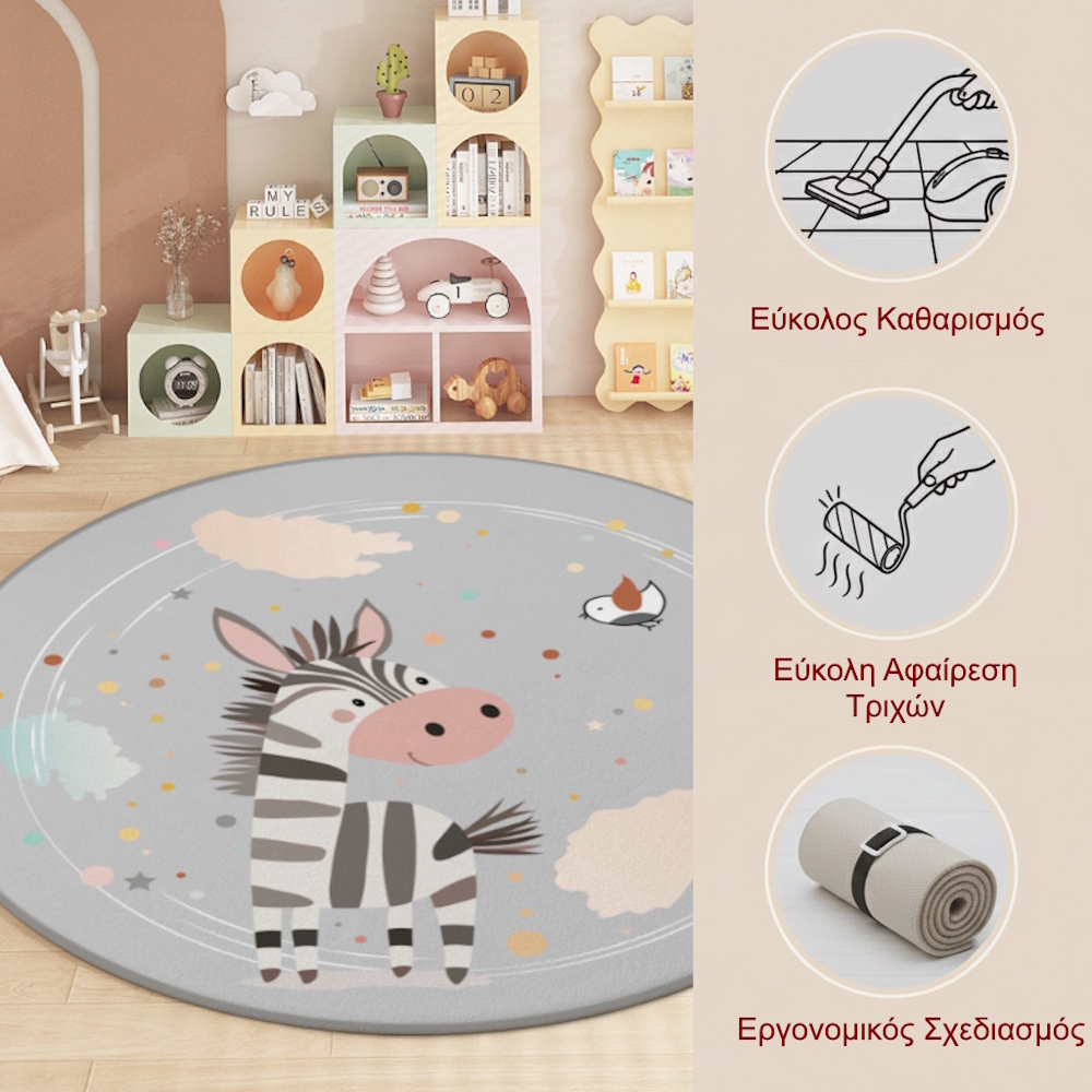 Στρογγυλό Παιδικό Χαλί Giggles & Co. με χαριτωμένο σχέδιο ζέβρας αποτελεί μια ιδανική επιλογή για τη δημιουργία ενός άνετου, ασφαλούς και αισθητικά ευχάριστου χώρου στο παιδικό δωμάτιο ή στο playroom. Ο παιχνιδιάρικος χαρακτήρας του σχεδίου συνδυάζεται με πρακτικά χαρακτηριστικά, ώστε να καλύπτει τις καθημερινές ανάγκες ενός παιδιού και να προσφέρει σιγουριά στους γονείς.