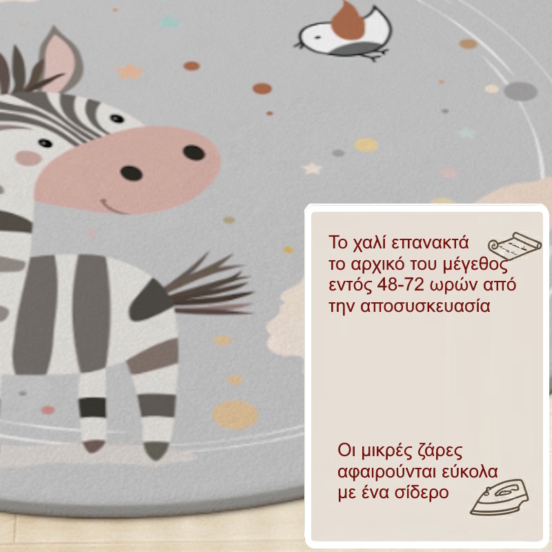 Το χαλί διαθέτει στρογγυλό σχήμα, που βοηθά στη σωστή οργάνωση του χώρου και δημιουργεί μια φιλόξενη γωνιά παιχνιδιού. Το σχέδιο απεικονίζει μια χαρούμενη ζέβρα σε ήπιους και ουδέτερους τόνους, με στοιχεία όπως σύννεφα, μικρά αστέρια και διακοσμητικές λεπτομέρειες που ενισχύουν τη φαντασία του παιδιού.