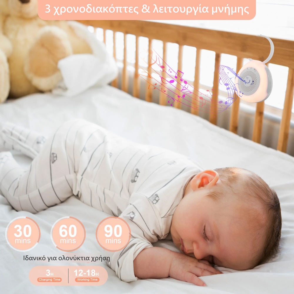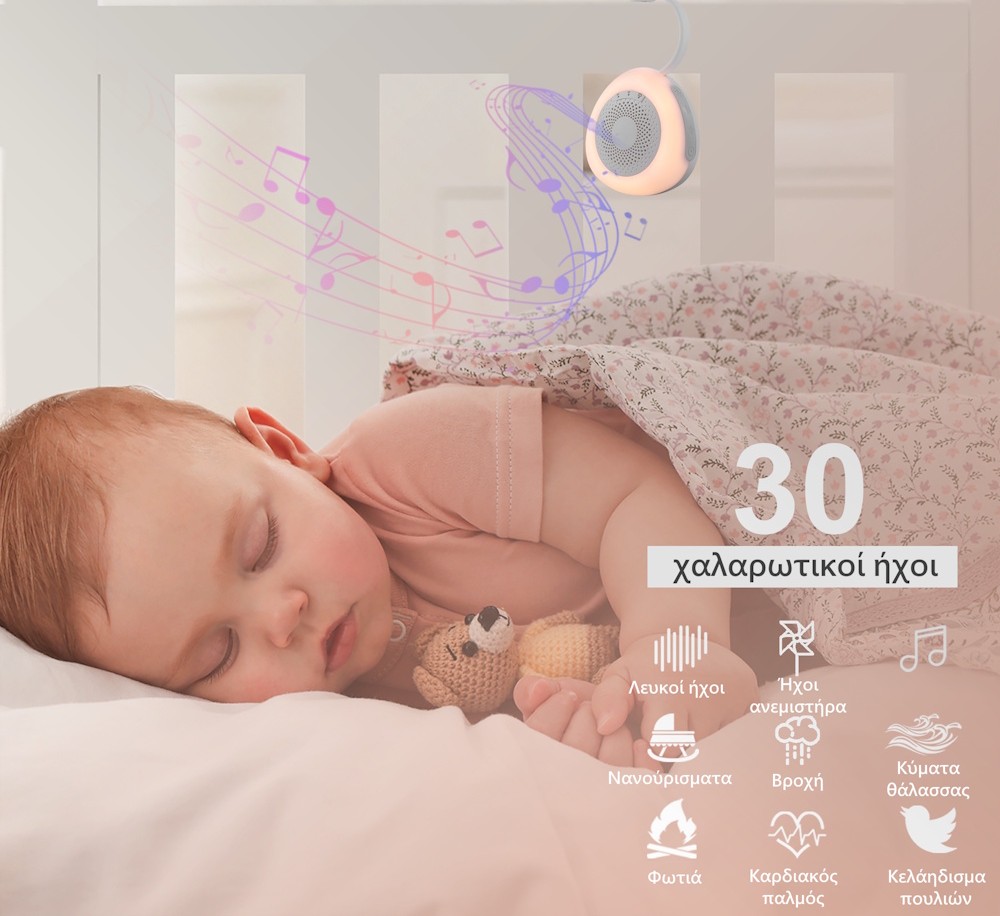 Η συσκευή διαθέτει 30 ήχους – νανουρίσματα, λευκούς ήχους και χαλαρωτικούς ήχους φύσης.