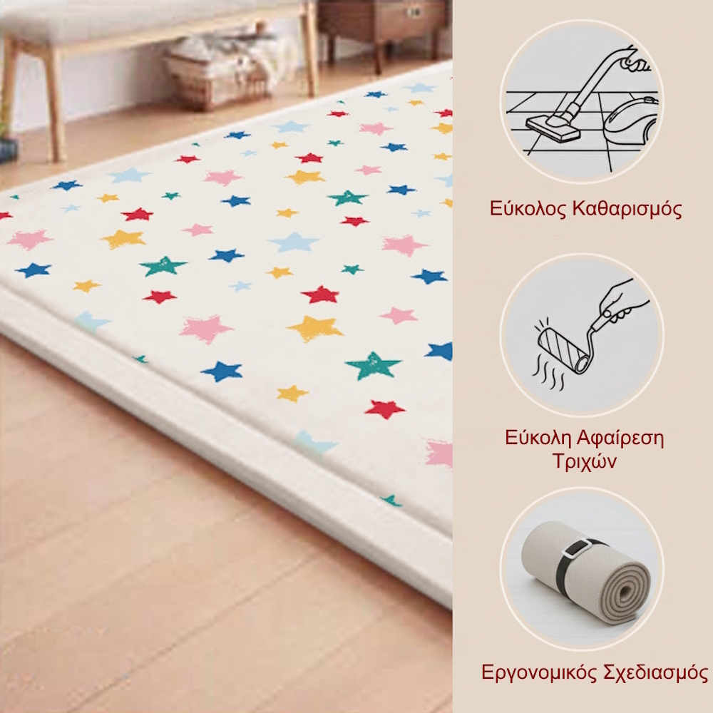 Το Χαλί Παιδικού Δωματίου Giggles & Co. “Colorfall Stars” είναι μια εξαιρετική επιλογή για γονείς που θέλουν να συνδυάσουν άνεση, ασφάλεια και αισθητική στον χώρο του παιδιού τους. Με διαστάσεις 200 × 150 εκ. και αυξημένο πάχος 3 εκατοστών, δημιουργεί μια μαλακή, προστατευμένη επιφάνεια που μετατρέπει το πάτωμα σε έναν ιδανικό χώρο παιχνιδιού, χαλάρωσης και δημιουργικής απασχόλησης.